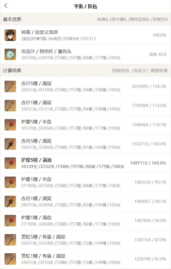 以顶配物理流钟芙茜皇这个新配队为例,不同武器配平词条后的实战伤害对比截图: