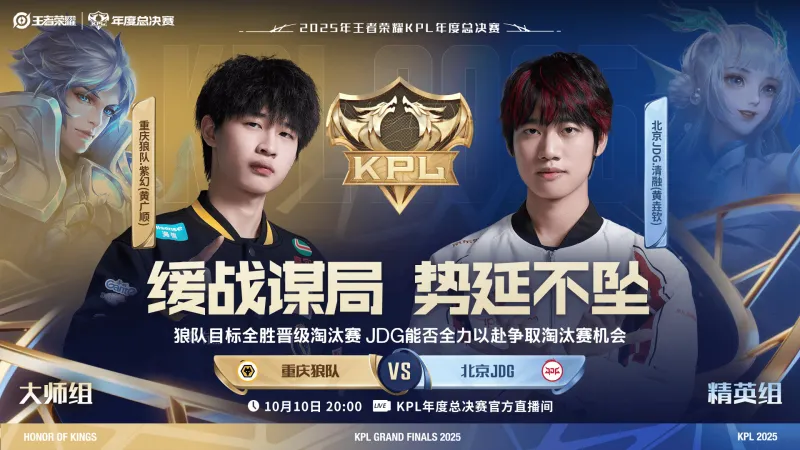 虎扑10月10日讯 [今日首发]对阵北京JDG,重庆狼队能否全胜晋级淘汰赛? 原文如下: 2025KPL年度总决赛 擂台赛W3D2【首发名单】出炉! 14:00 杭州LGD.NBW vs 上海EDG.M 17:00 佛山DRG vs 苏州KSG 20:00 重庆狼队 vs 北京JDG 评论席:小鹿 (陆舒媛)、老王 (王华斌)、阿豆 (蒋涛)、久诚 (曹志顺) 解说席&主持人:李九 (李昂)、北岛 (王东)、天云 (高天云)、一雪 (王一雪)、潇洒 (李潮) 零封对手即可晋级淘汰赛,杭州LGDNBW 能否愈战愈勇延续胜利?还是上海EDGM 能够拿到自己在年总舞台的大场首胜,锁定突围赛? 上场失利的佛山DRG 能否调整状态,大比分战胜对手晋级淘汰赛?苏州KSG本场失败将锁定突围赛,他们能否为自己争取更有利的积分形势? 重庆狼队能否保持火热手感,用全胜战绩晋级淘汰赛?还是北京JDG 战胜强敌攻擂成功,保留直接晋级淘汰赛可能? 敢逐云霄志!哪三支战队能够拿下胜利呢?让我们一起期待