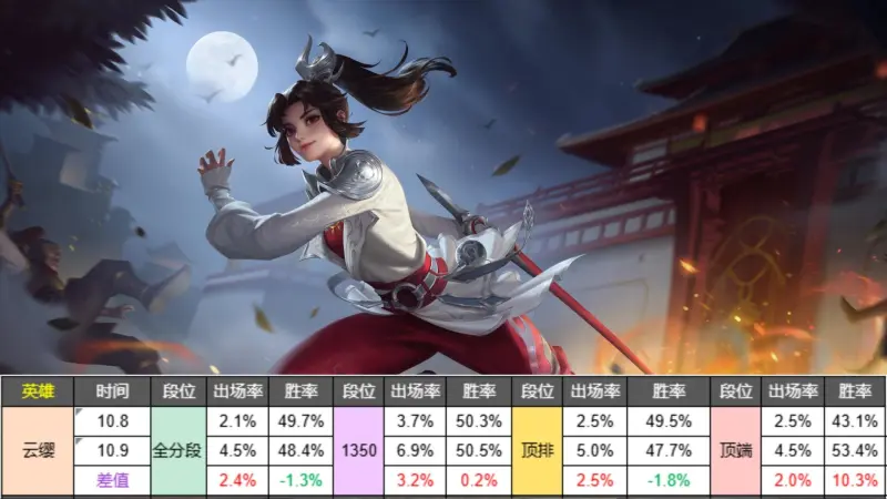 云缨数值改版第一天,数据变化如上,出场率涨幅也并不算高,最多的巅峰赛1350也才涨了3.2%,对比其他重做的英雄,这个数据算是相当冷门了。 因为是第一天调整,所以很多人沿用了以前的出装,可能也因此才让胜率不升反降,后续出装如果稳定了,可能会回升。 有意思的是,顶端局中胜率涨幅达到了10%,这是很夸张的数据,但原本2.5%的出场率,真的不用太在意,因为之前偶尔还能涨到51%左右呢。