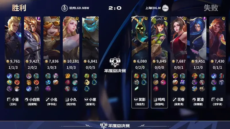 点击链接 为双方选手第2局表现打分>> Game2(BO5组外单循环): 【Ban/Pick】 蓝色方:杭州LGD.NBW(大师组) 禁用:空空儿 镜 大司命 关羽 夏侯惇 选用:小落狂铁 小白熊杨戬 小名沈梦溪 小久艾琳 小崽盾山 红色方:上海EDG.M(精英组) 禁用:苏烈 鲁班大师 戈娅 阿古朵 元流之子坦克 选用:小泽孙策 夏凌橘右京 花卷不知火舞 鸣鸣孙尚香 笑影太乙真人