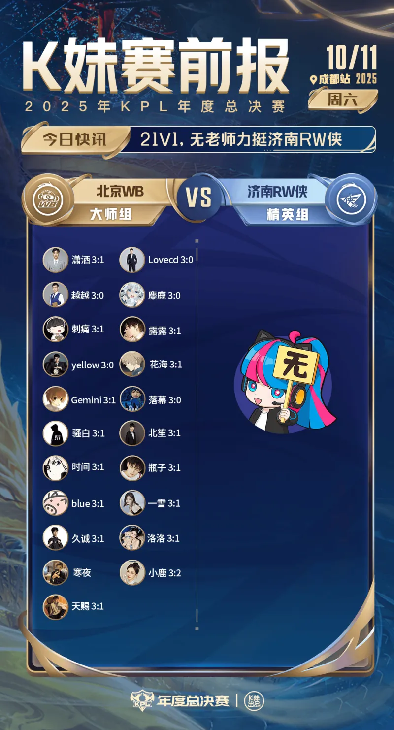 虎扑10月11日讯 [K妹赛前报]收官日无老师三度登场,全员看好TTG/WB/AG 原文如下: 2025KPL年度总决赛 擂台赛最后一日【K妹赛前报】送达! TTG对战情久 :21v1,无老师力挺桐乡情久; WB对战RW :21v1,无老师力挺济南RW侠; AG对战TES :21v1,无老师看好长沙TES.A; (预测收集截至今日13:00)
