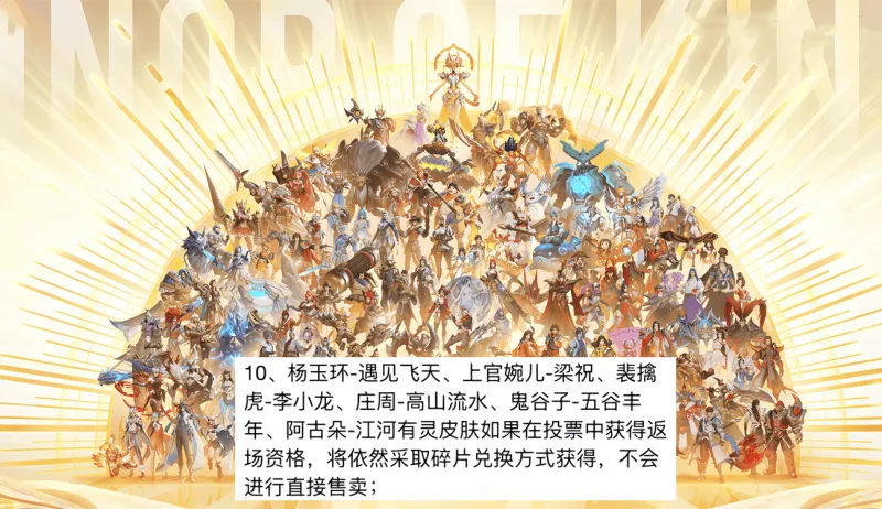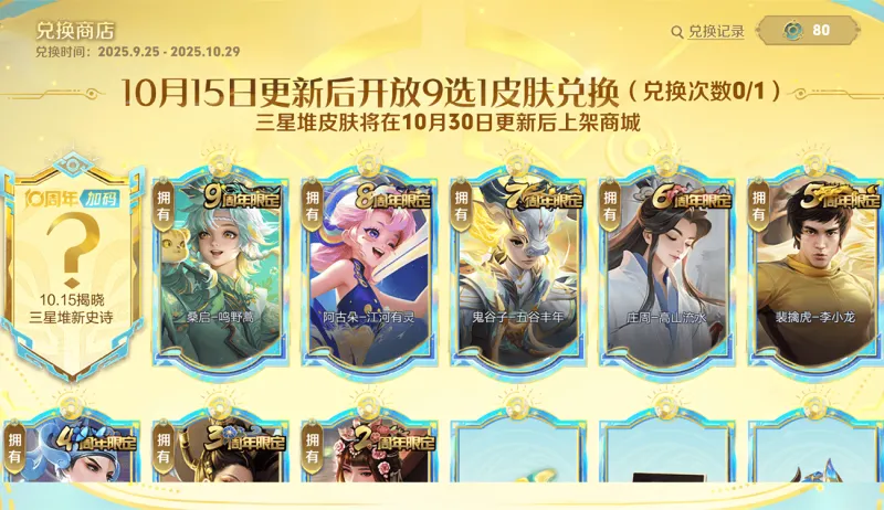 同时有小伙伴提到,往年的周年皮肤可以拿皮肤碎片在碎片商城中兑换,确实如此,比如九周年的桑启鸣野蒿,在10月26日开放领取那天,就同步上架了碎片商城,但根据公告暂时只说了9选1活动结束后,三星堆史诗皮肤上架商城直售,更何况后面还有10周年传说限定皮肤免费送,因此三星堆会不会上架碎片商城还是个未知数,要等后续官方公告。 以上就是2-10周年限定皮肤9选1活动的选择,对2-8周年皮肤不全,尤其是缺桑启鸣野蒿的小伙伴来说,小心不要踩坑哦,10周年的三星堆并不是首选,选缺少的周年皮肤性价比更高。 |