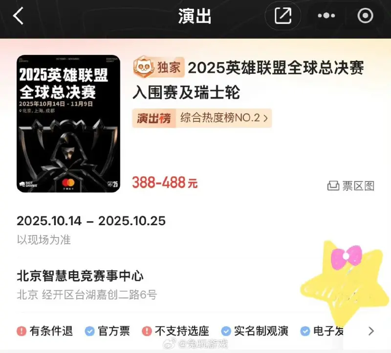 2025英雄联盟全球总决赛将于10月14日至11月9日在北京、上海、成都举行,北京阶段第二轮售票信息如下 北京(入围赛和瑞士轮) 北京时间2025年10月13日中午12点在猫眼演出进行所有场次的最后一次开售, 本次开售所有门票均为首轮开票后产生的退票。根据已公布的票务规则,退票重新销售不保证连座,第二轮购票不接受任何形式退票,请谨慎购买,其他相应票务政策请以猫眼演出购票页面为准