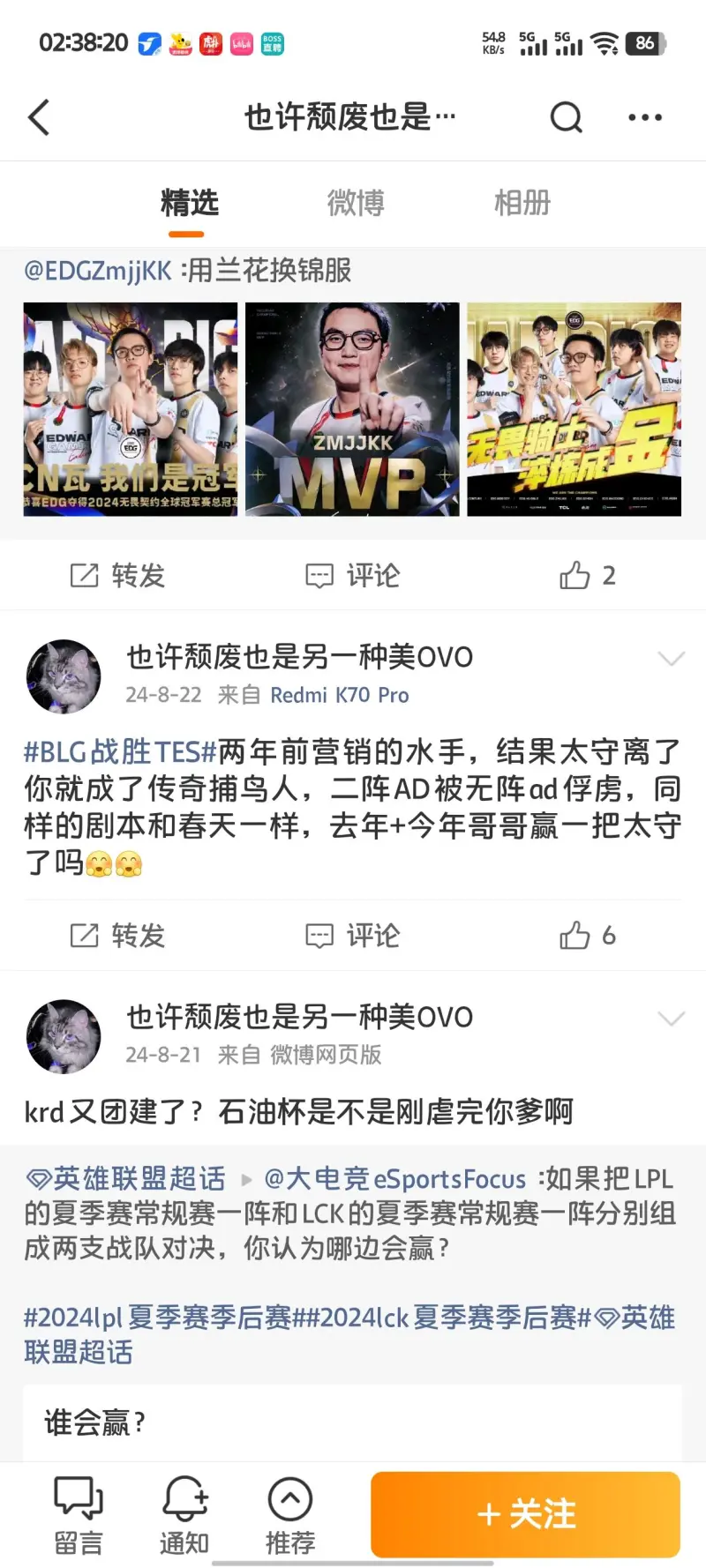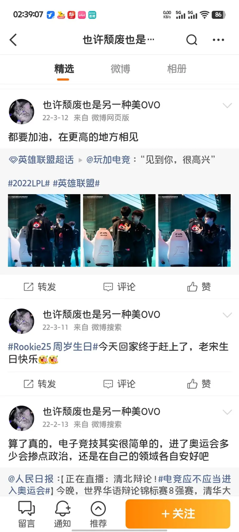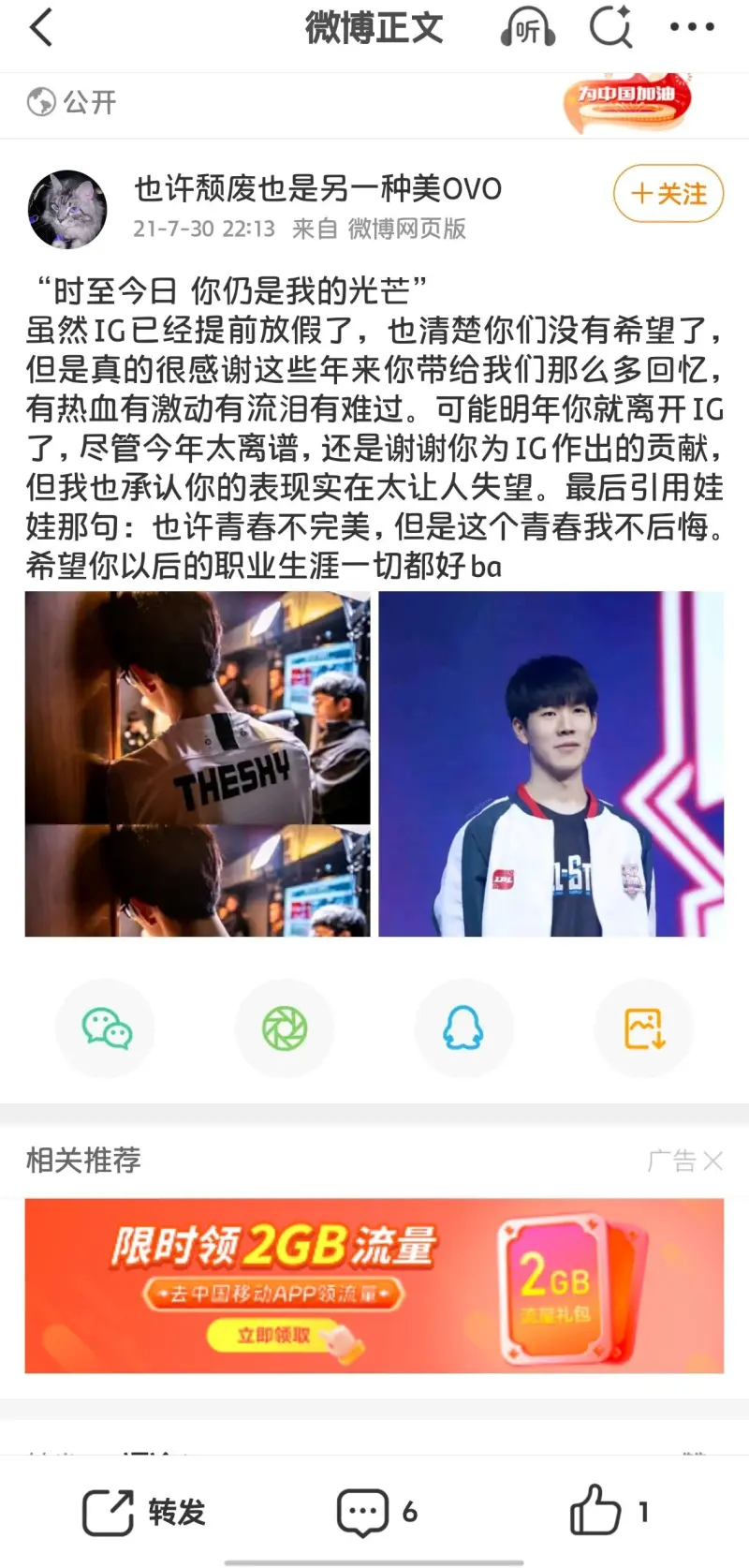 | 事情是这样的,本来发一段猴子出局,和肉鸡对比的评论,某个人评论我,ig 14号 要被t1,称肉鸡为过期泡面,这都没啥,点进去一看是加入blg超话,这也很正常,但是翻过去几年的记录,从夸ig各个成员,到黑ts 肉鸡 jkl,不过区区两年不到,这变形之快,放70年妥妥的寒剑啊 大家可以去看看