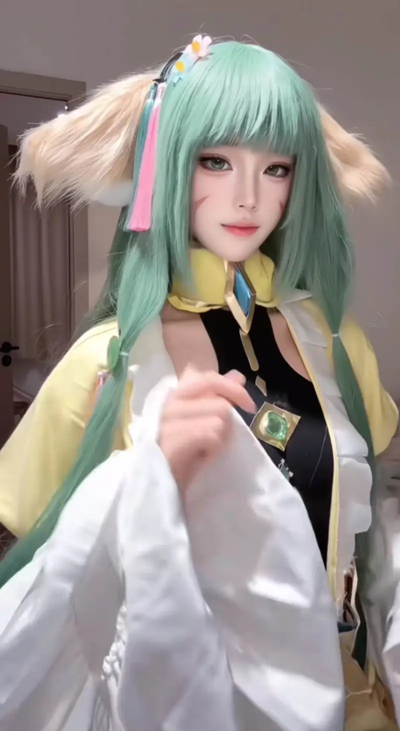 所以,雪梨语这个“官方合作coser”在近期就cos了这款皮肤。其实关注王者荣耀短视频平台账号的玩家都知道,官方好喜欢搬运雪梨语的视频发在自己账号上面,甚至有时候为了爆料自己的皮肤,也会搬运雪梨语的cos视频。所以雪梨语也被很多玩家戏称为“爆料博主”。 能看到雪梨语cos的公孙离涂山苏苏这个造型也是非常还原的,能看到她身穿一身黄色的衣裙,里面还搭配着白色的衬衫,头上戴着绿色的假发,平刘海,两边耳朵是毛绒绒的双色耳朵。