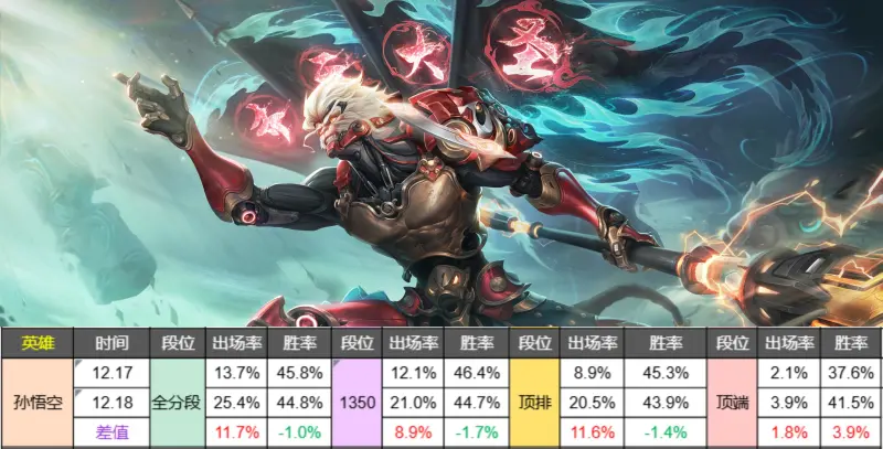 数据方面,我只能说不愧是猴哥,排位出场率暴涨11%以上,巅峰赛涨幅也接近9%,这个人气只能用一句“恐怖如斯”来评价了。 然而与之对应的是比较尴尬的胜率,原本就处于地板级的胜率,如今更是不升反降,说好的纯加强呢,这不是打人脸吗? 其实胜率要和出场率一起看才靠谱,热度暴涨,势必会有很多跟风的玩家进入,不熟悉,自然也就拉低了总体的胜率,加上新玩法大家都在开发,因此这个胜率降幅其实是可以接受的。