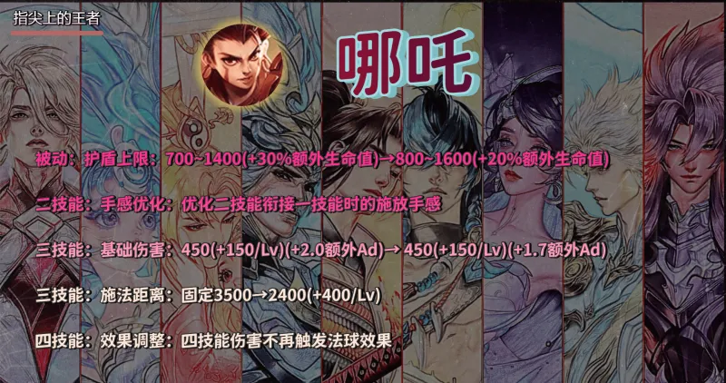 首先来看哪吒的调整,之前跟大家分析过,哪吒唯一的加强就是二技能的手感优化,在21连招的时候相对更丝滑,然而哪吒不具备爆发,21连招快一点也不会让他的输出产生质变,因为技能也不涉及控制,这个手感优化远无法和曹操和狄仁杰相比。 再一点就是一级时的护盾上限高了几十点,余下的时间,余下的调整,尽数都是削弱向。 所以胜率下滑是肯定的,至于能下滑多少,是否达到了策划的预期呢?