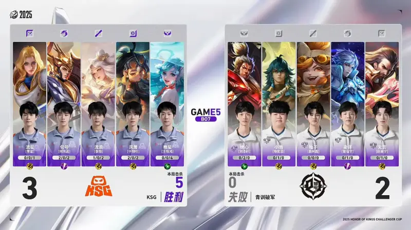 点击链接 为双方选手第5局表现打分>> Game5(BO7全局BP+巅峰对决): 【Ban/Pick】 蓝色方:KSG(年度总决赛 六强) 禁用:盾山 海月 元流之子坦克 裴擒虎 娜可露露 选用:流星夏洛特 句号杨戬 流浪嫦娥 风箫蚩奼 晚星朵莉亚 红色方:青训破军(小银龙挑战赛 冠军) 禁用:鲁班大师 空空儿 不知火舞 赢政 小乔 选用:无言曹操 染详诸葛亮 柚子沈梦溪 小雨苍 绝心张飞