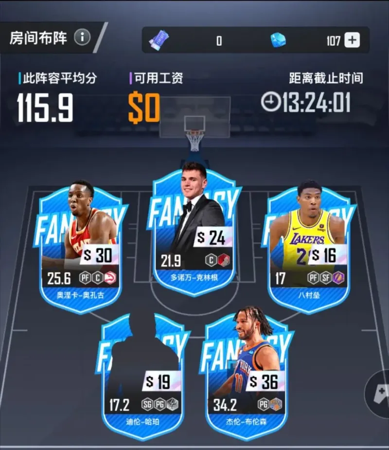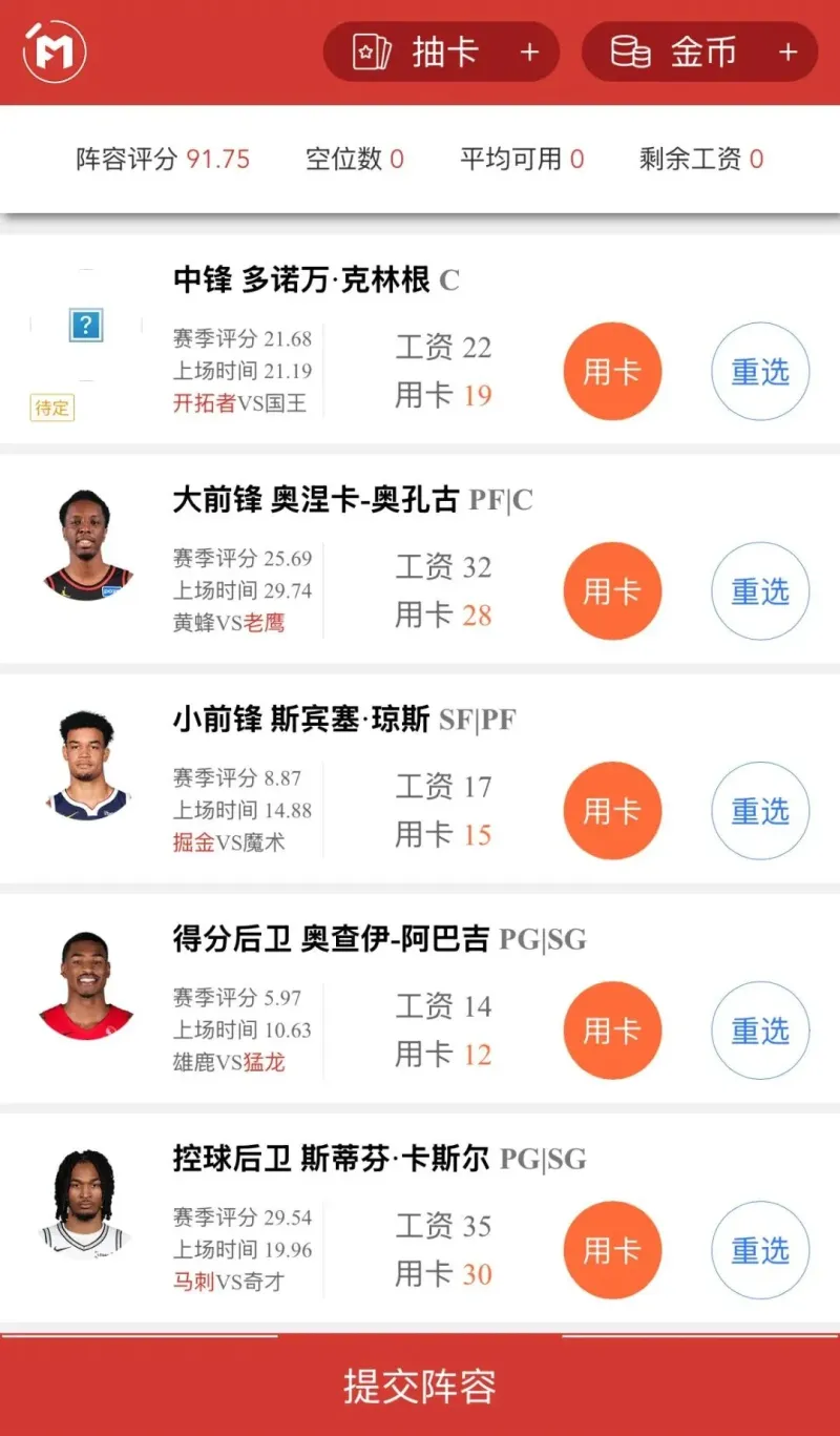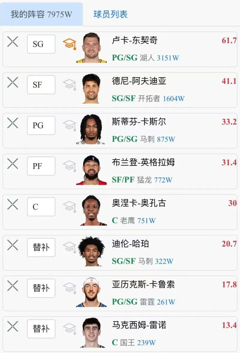 冠军组合的球员身价上涨下调较快,而且有一些“预判”涨价,导致一些提前已知的红利球员身价过高。而且因为没有队长功能,阵容讲究均衡,单一大核并不能带来额外收益,还容易被迫选到没时间的角色球员。 不过好在明天的比赛足够多,选到5个性价比合适的球员还是不难的。 中锋选开拓者的克林根,因为长期缺席,克林根的身价只有22了,上周赛程偏向NBA杯赛,让他也得到了充足的恢复时间。目前开拓者的先发中锋上场时间为25分钟左右,面对国王孱弱的内线,这个时间完全足够回本了,拿下一个高效两双应该问题不大。 控卫选择马刺的卡斯尔,尽管福克斯和文班都在,但是卡斯尔的持球权重依然不低,比赛感官上,攻防两端存在感极强。面对年轻且体系不成熟的奇才,卡斯尔应该能得到一个全面的数据,除了助攻,他在防守副业上也有一定的爆发力。 内线选择老鹰的奥孔古,铂金缺席,奥孔古的时间拉满,而且和JJ不同,奥孔古本身持球任务不重,吃饼和投空位三分为主,吹杨的回归不仅没有害处,他的传球和吸引火力的能力还能帮助奥孔古得到更多空位,价格虽然不低,但也能上。 剩下的预算不多,选了两个时间稳定的角色球员,猛龙的阿巴吉目前坐稳首发,出场个25分钟问题不大。掘金的琼斯也是目前红利期的球员,沃特森和哈达威出战成疑,他明天可能获得额外的时间。当然,他俩的对位不算好,但是角色球员这个预算下就不看对位了(太奢侈),时间够就可以。 梦幻NBA阵容