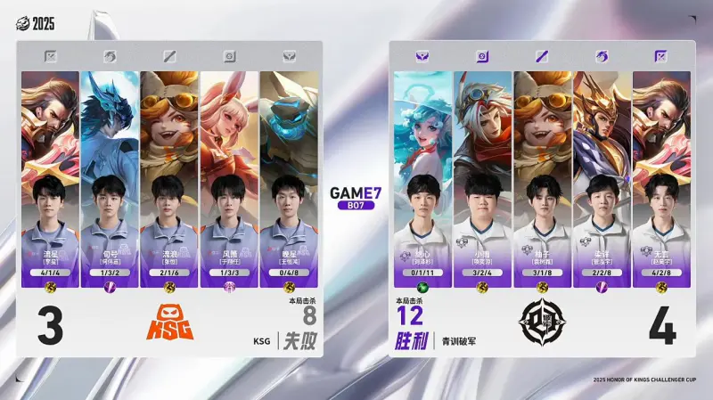 点击链接 为双方选手第7局表现打分>> Game1(BO7全局BP+巅峰对决): 【Ban/Pick】 蓝色方:青训破军(小银龙挑战赛 冠军) 禁用:海月 海诺 暃 镜 沈梦溪 选用:无言夏洛特 染详橘右京 柚子赢政 小雨戈娅 绝心空空儿 红色方:KSG(年度总决赛 六强) 禁用:盾山 鲁班大师 西施 大司命 不知火舞 选用:流星狂铁 句号宫本武藏 流浪女娲 风箫公孙离 晚星张飞