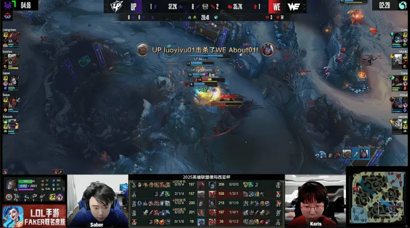 点击为本场选手评分>>> 虎扑12月18日讯 GAME1:UP蓝色方;WE红色方 【英雄BP】 UP禁用:沙皇;芸阿娜;妮蔻;雷克赛;泰坦 UP选用:Liangchen塞恩;luoyiyu狼母;Saber发条;baiye卢锡安;xiaoxia布隆