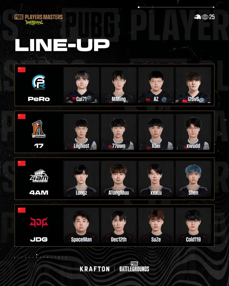 中国赛区 PeRo Cui71、MMing、AZ、i26v6 17Gaming Lilghost、 77owo、 Xbei、 xwudd 4AM Longz、 ATongMuu 、 xxxLu、 Shen JDG SpaceMan 、 Dec12th 、 SuZe、 Cold119