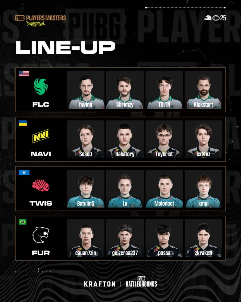 美洲赛区 Team Falcons hwinn、 Shrimzy 、 TGLTN、 Kickstart FURIA cauan7zin 、 guizeraa237 、 possa 、 zkrakeN EMEA 赛区 Natus Vincere Sosed、 Hakatory 、Feyerist、ext4nz Twisted Minds BatulinS、 Lu 、 Molodoct、xmpl